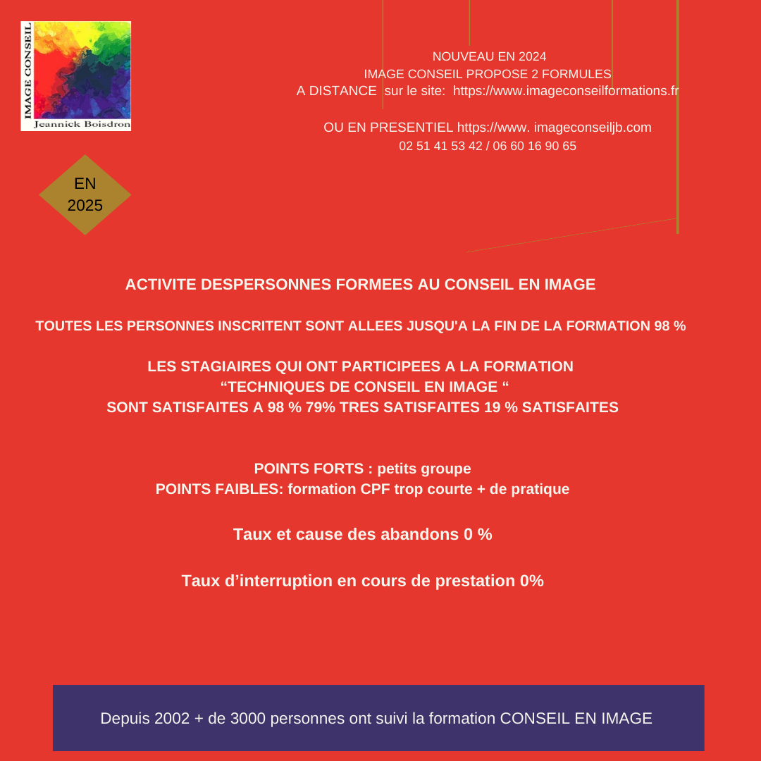 Image conseil est une école et un institut de conseil en image pour particuliers et professionnels. Il a été fondé en 2000 par Jeannick Boisdron, dirigeante pendant 20 ans dans le monde du prêt à porter et du stylisme. 3 pôles d’activités :